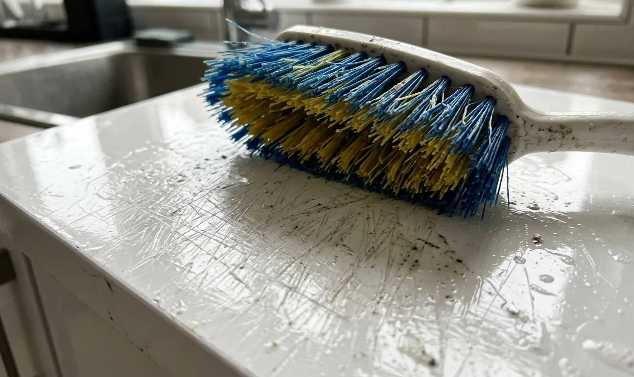 Sokan a hagyományos háztartási keféket használják a megrögzött lepedék kezelésére, arra számítva, hogy ezzel időt takarítanak meg. Kezdetben úgy tűnik, hogy a merev bolyhok tökéletesen elvégzik a munkát, és azonnal lesikálják a lepedéket. Száradás után azonban az anyag hátrahagyja a következőket mikrokarcolásokA következő alkalommal, amikor főzöl vagy használod a vizet, még több szennyeződés reked bennük.