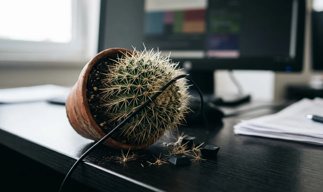 A monitor és a szervező közötti szűk térben egy növény gondozása rendkívül kényelmetlen. Nem egyszer azon kaptam magam, hogy véletlenül hozzáértem a tüskékhez, miközben egy pendrive vagy jegyzettömb után nyúltam.